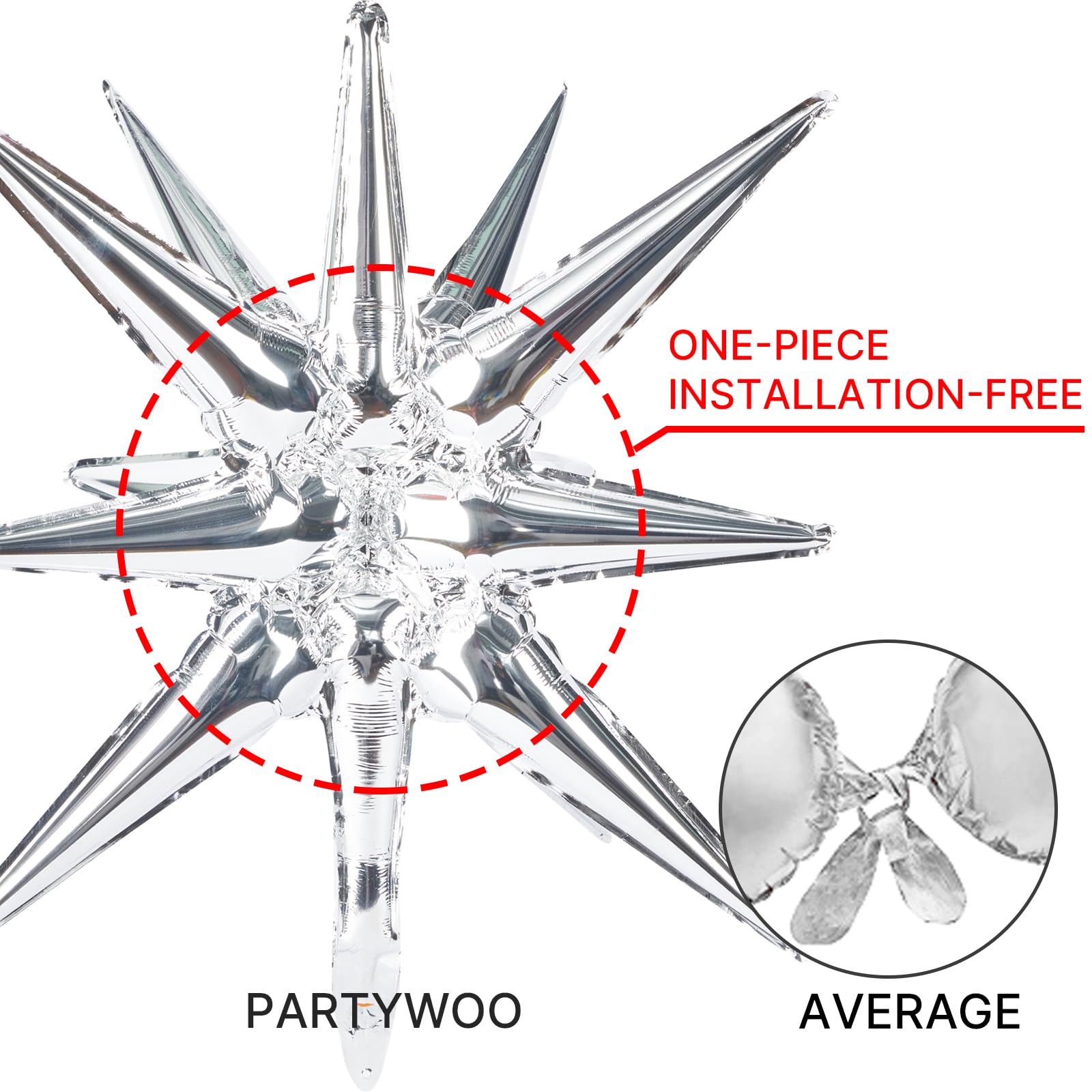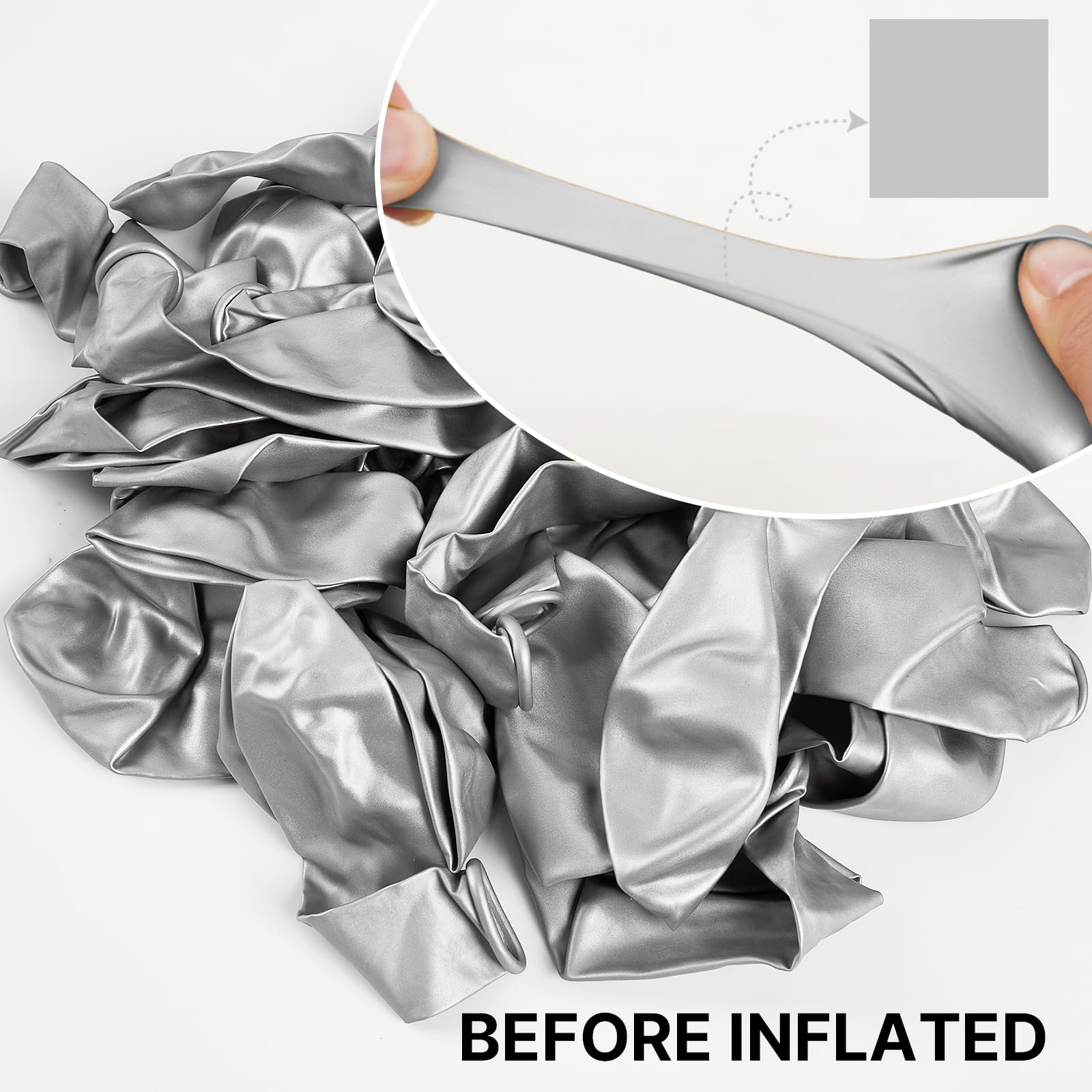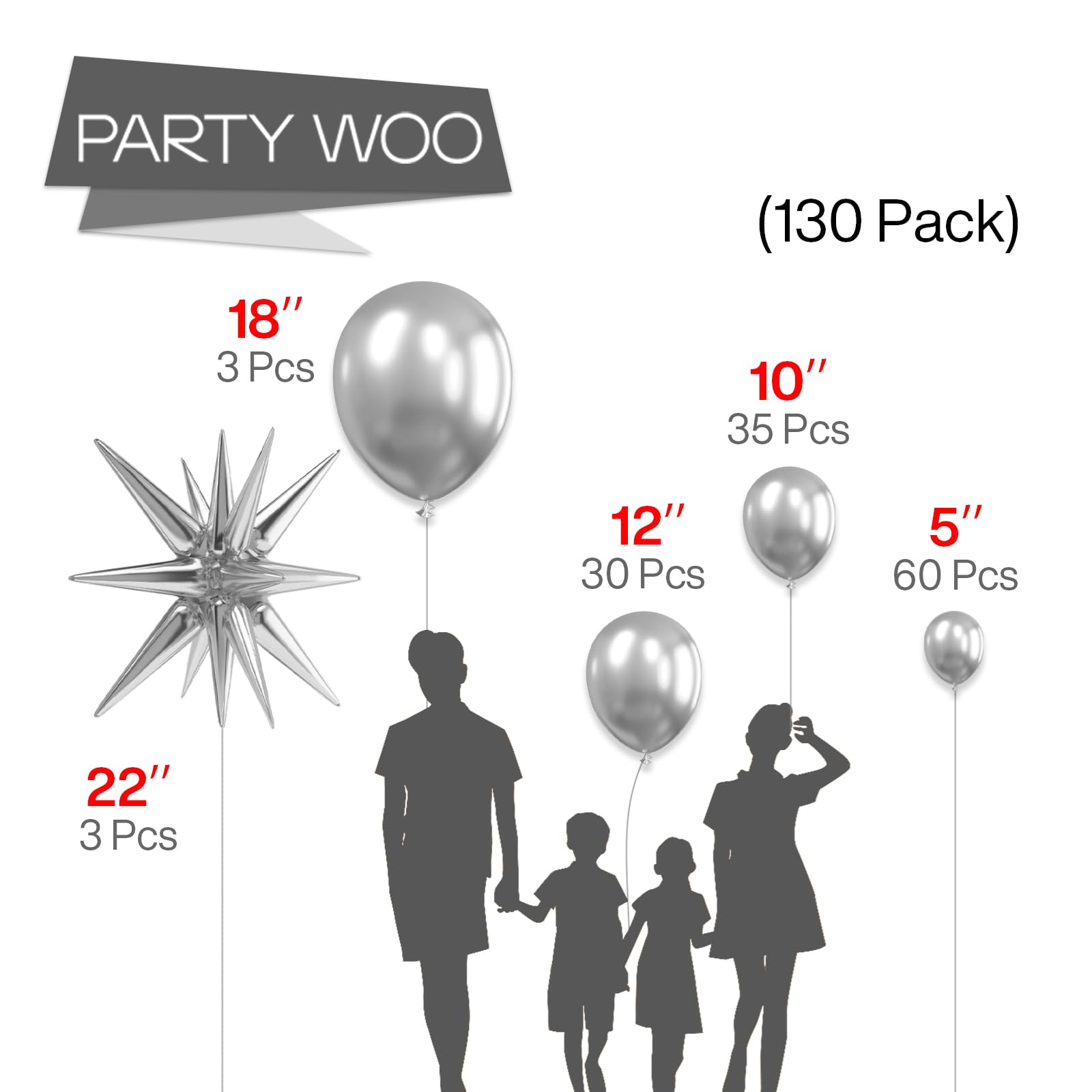 - 110 PCS METALLIC SILVER BALLOONS DIFFERENT SIZES: Package includes 22 inch foil star balloons (3 pcs), 18 inch balloons (2 pcs), 12 inch balloons (20 pcs), 10 inch balloons (30 pcs), 5 inch balloons (55 pcs), balloon decorating strip included. Due to the special shape of star balloons, they cannot float when filled with helium. It is recommended to fill them with air